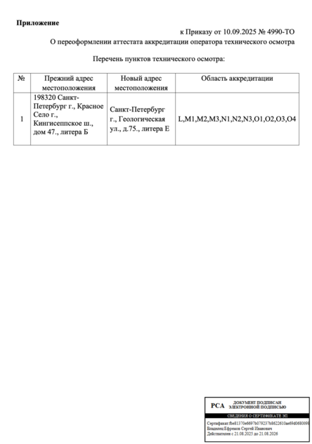 Область аккредитации: L, M1, M2, M3, N1, N2, N3, O1, O2, O3, O4