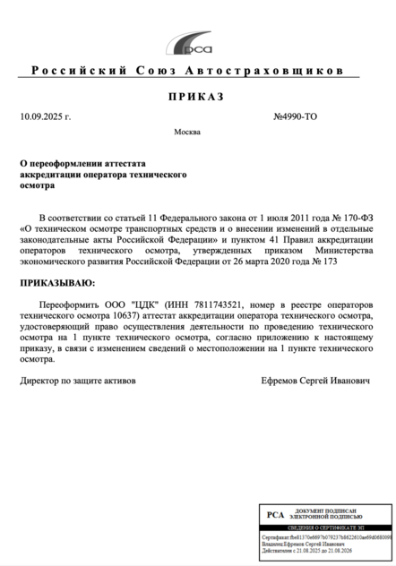 ООО "ЦДК" внесён в реестр операторов технического осмотра за №170070. По номеру оператора, указанному в аттестате, можно проверить аккредитацию на сайте РСА.